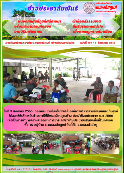 วันที่ 9 สิงหาคม 2566 กองคลัง งานจัดเก็บรายได้ องค์การบริหารส่วนตำบลหนองภัยศูนย์ได้ออกให้บริการรับชำระภาษีที่ดินและสิ่งปลูกสร้าง ประจำปีงบประมาณ พ.ศ.... [9 สิงหาคม 2566]