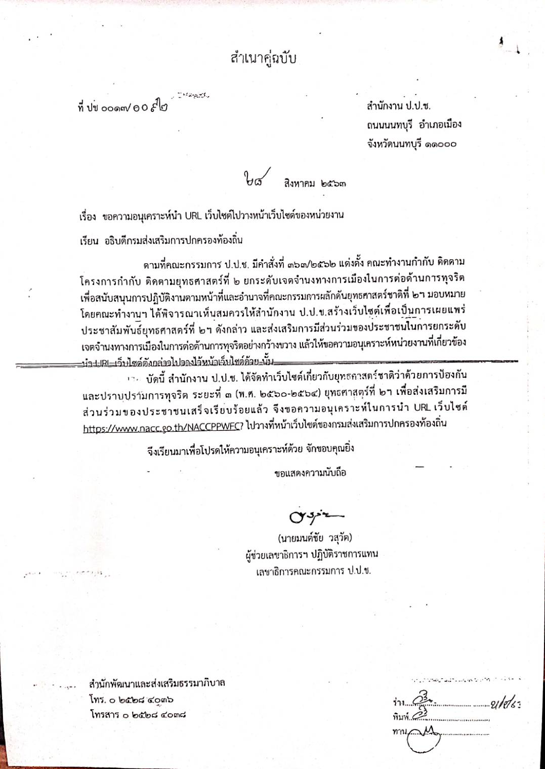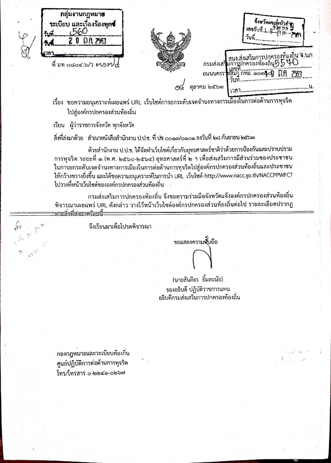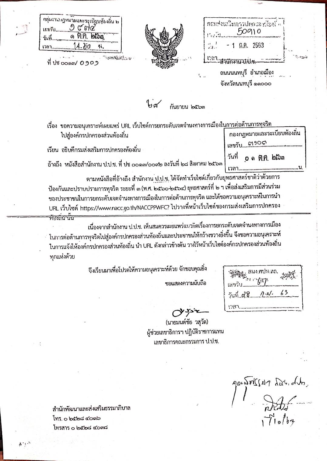 ขอความอนุเคราะห์เผยแพร่ URL เว็บไซต์การยกระดับเจตจำนงทางการเมืองในการต่อต้านการทุจริตไปสู่องค์กรปกครองท้องถิ่น