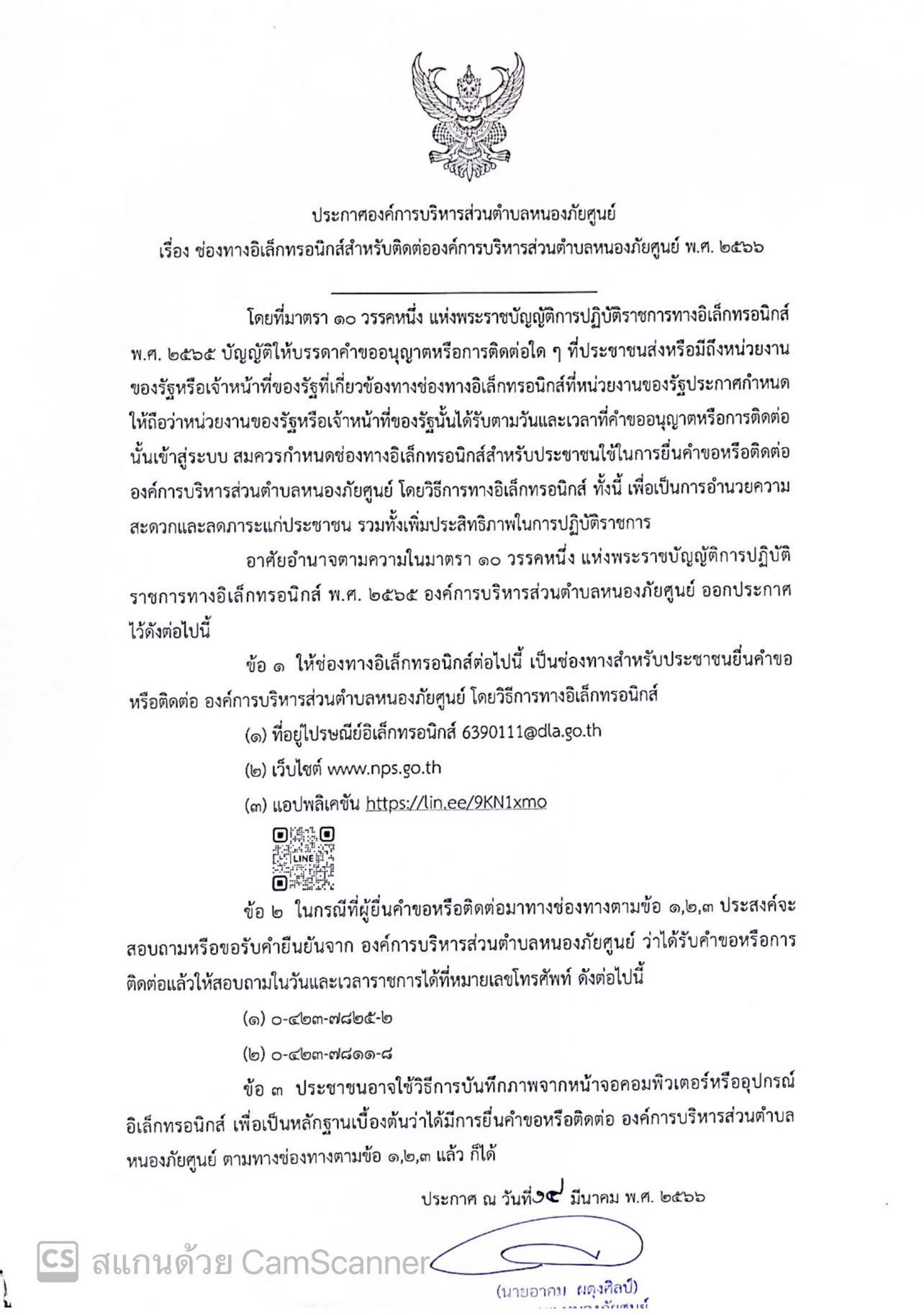 ช่องทางอิเล็กทรอนิกส์สำหรับติดต่อองค์การบริหารส่วนตำบลหนองภัยศูนย์ พ.ศ. 2566
