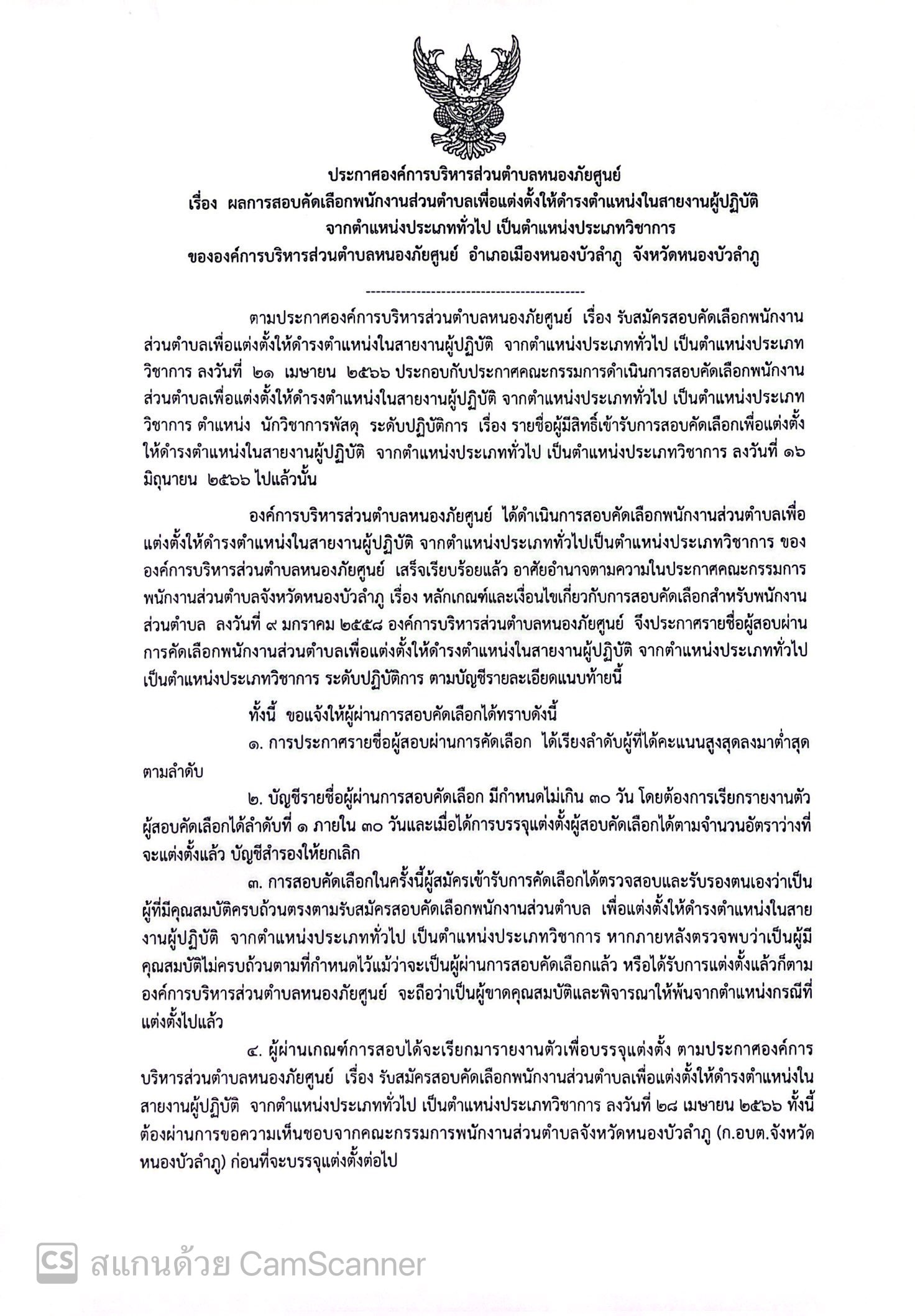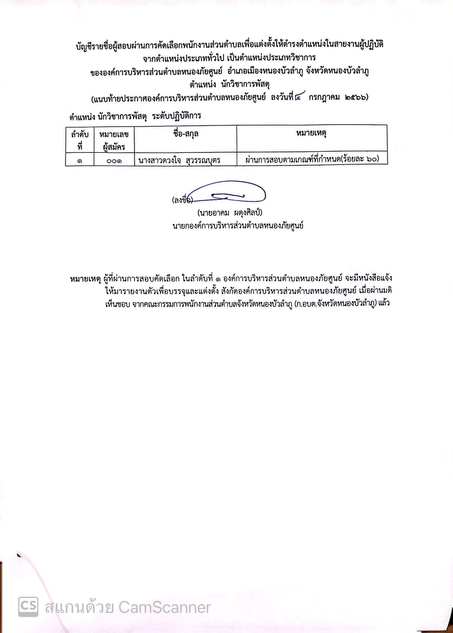 ผลการสอบคัดเลือกพนักงานส่วนตำบลเพื่อแต่งตั้งให้ดำรงตำแหน่งในสายงานผุ้ปฏิบัติ จากตำแหน่งประเภททั่วไป เป็นตำแหน่งประเภทวิชาการ ขององค์การบริหารส่วนตำบลห