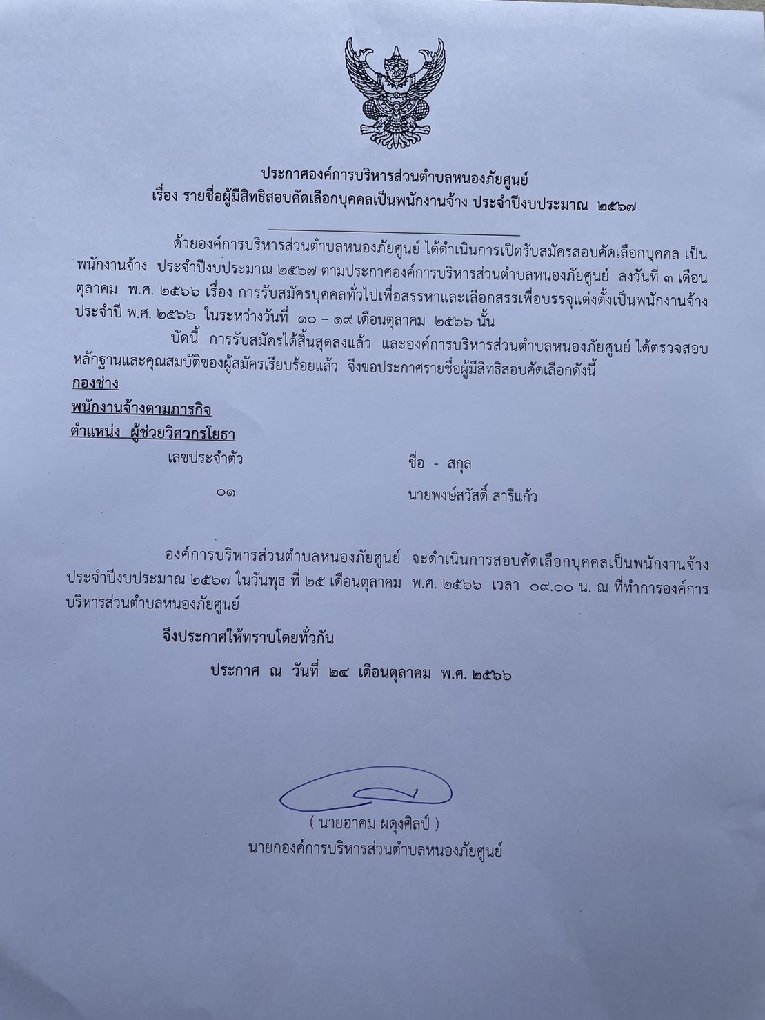 รายชื่อผู้มีสิทธิสอบคัดเลือกบุคคลเป็นพนักงานจ้าง ประจำปีงบประมาณ พ.ศ.2567