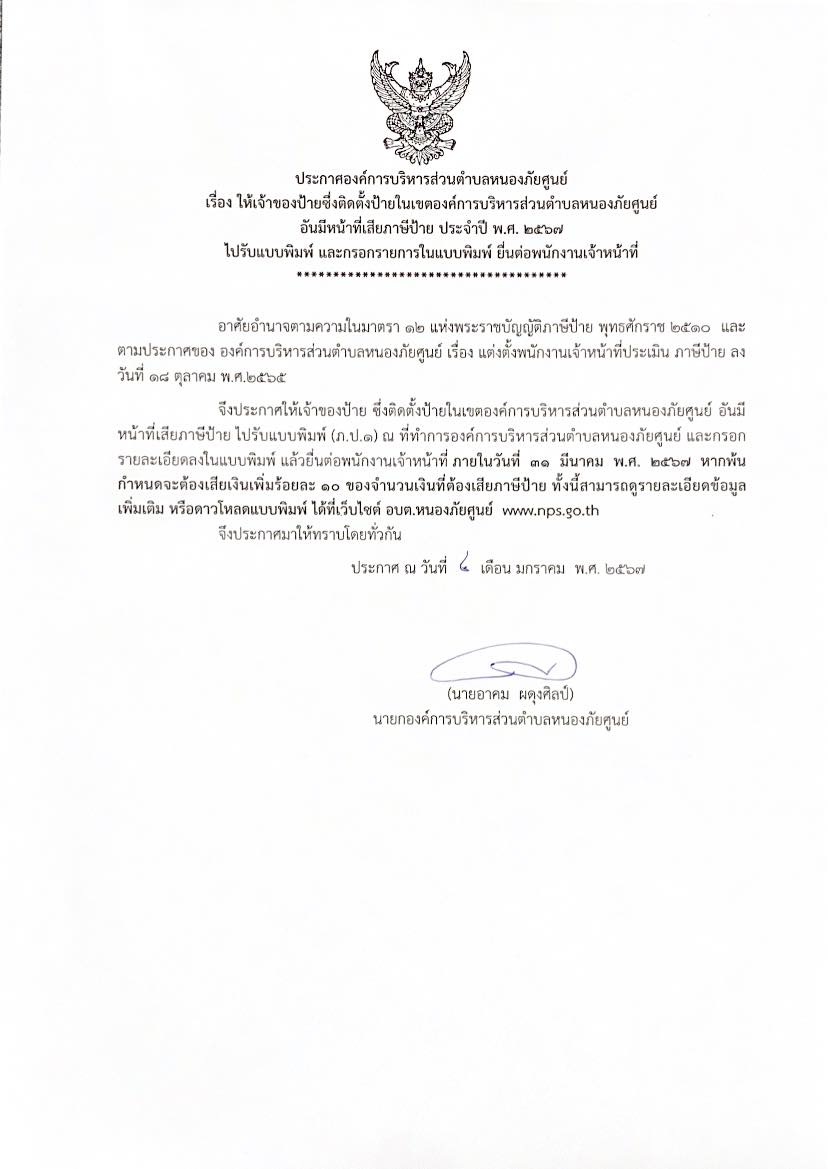 เจ้าของป้ายซึ่งติดตั้งป้ายในเขตองค์การบริหารส่วนตำบลหนองภัยศูนย์ แจ้งยื่นแบบประเมินภาษีป้าย สามารถยื่นแบบได้ภายใน วันที่ 31 มีนาคม พ.ศ.2567