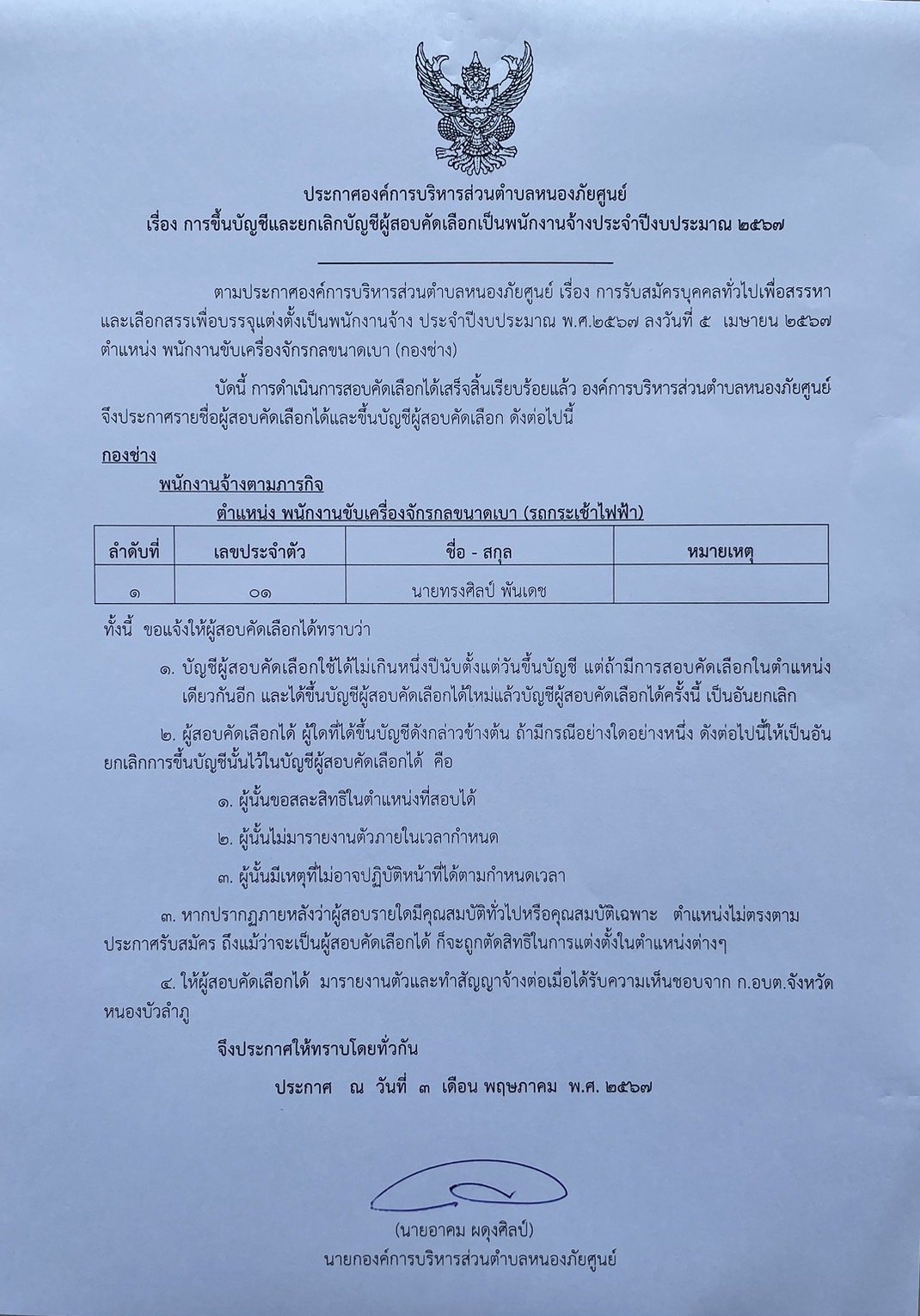 การขึ้นบัญชีและยกเลิกบัญชีผุ้สอบคัดเลือกเป็นพนักงานจ้างประจำปีงบประมาณ 2567