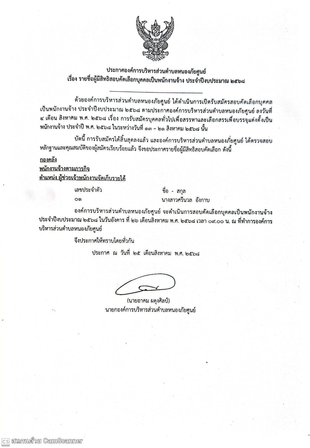 รายชื่อผู้มีสิทธิสอบคัดเลือกบุคคลเป็นพนักงานจ้าง ประจำปีงบประมาณ ๒๕๖๘