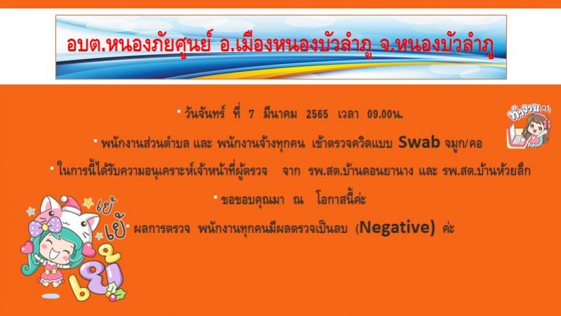 วันที่ 7 มีนาคม 2565 คณะผู้บริหาร พนักงานส่วนตำบลและพนักงานจ้างทุกคน เข้ารับการตรวจหาเชื้อไวรัสโคโรน่า 2019 โดยได้ประสานขอความร่วมมือเจ้าหน้าที่จาก โรงพยาบาลส่งเสริมสุขภาพตำบลบ้านดอนยานางและโรงพยาบาลส่งเสริมสุขภาพตำบลบ้านห้วยลึก